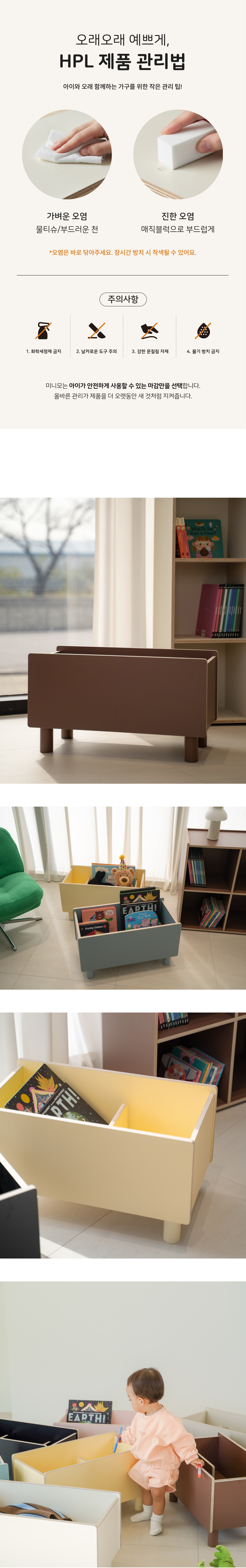 - HPL은 습기와 스크래치, 생활오염에 강한 마감재입니다. 오염이 묻었을 경우 물티슈나 깨끗한 천으로 가볍게 닦아주시면 됩니다.